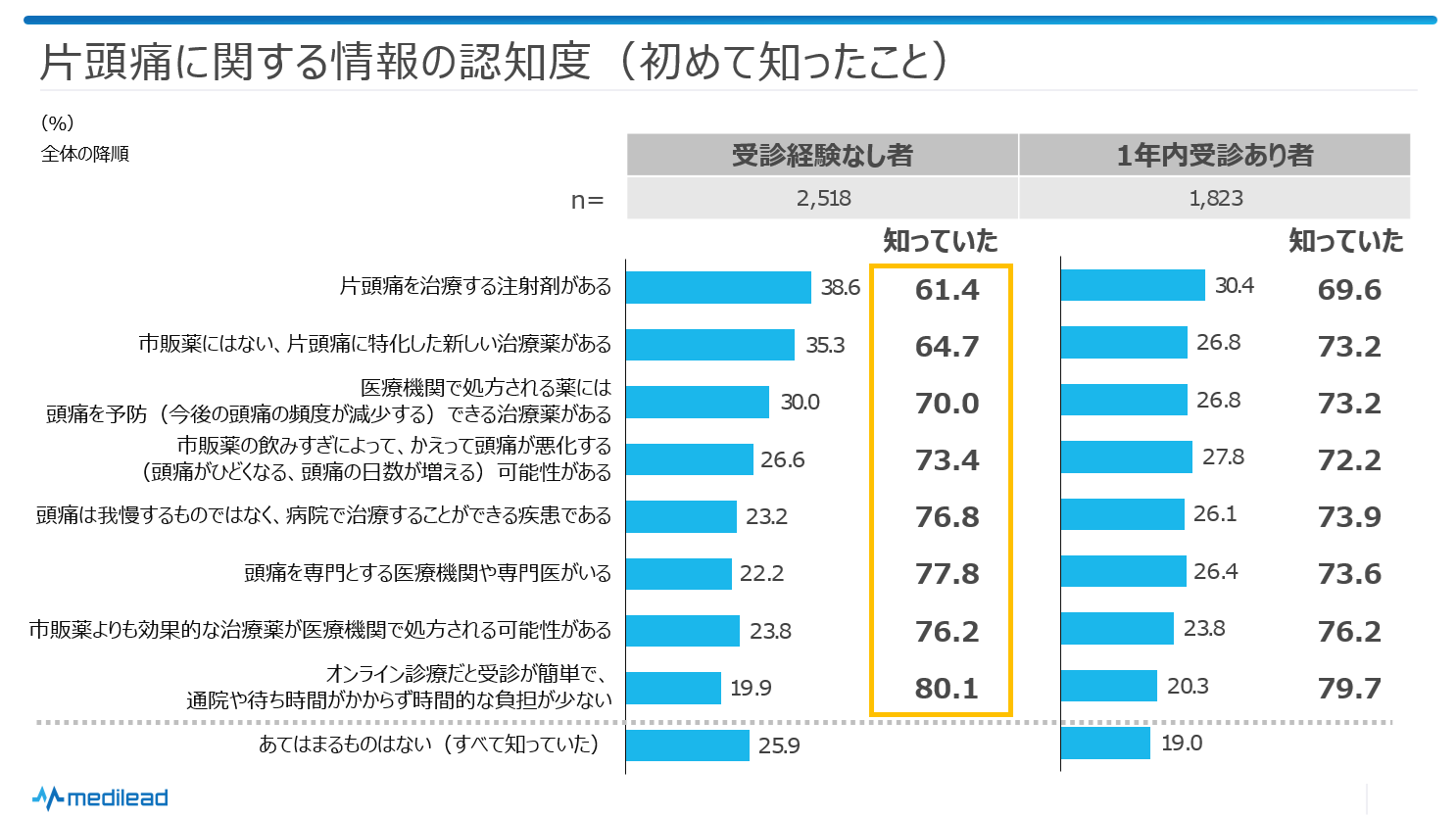 中でも「頭痛は我慢するものではなく、病院で治療できる疾患である」という情報については、受診経験がない人でも76.7%がすでに認知していることがわかりました。