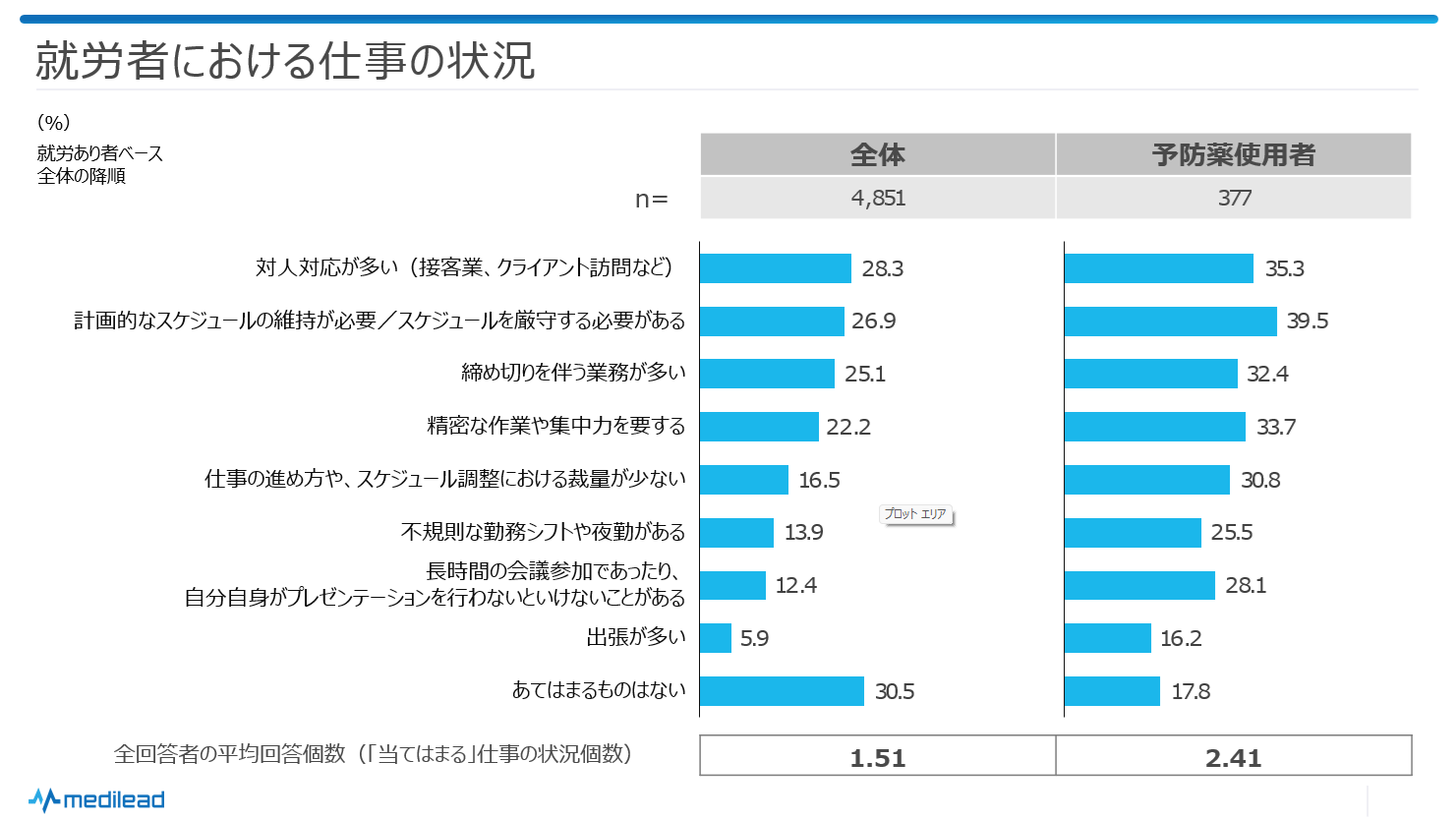 就労者に対し、仕事における自身の状況について尋ねた結果、予防薬使用者は全体と比較して提示項目に対して「あてはまる」と感じている人が多いことが明らかになりました。つまり、「片頭痛により仕事に支障をきたしそう」だと自覚している人が予防薬の使用に至っている傾向があると考えられます。