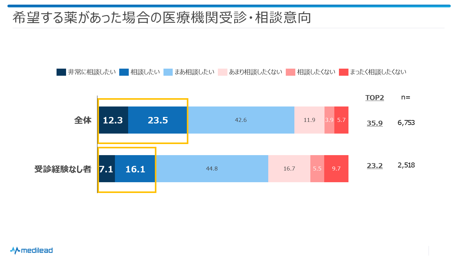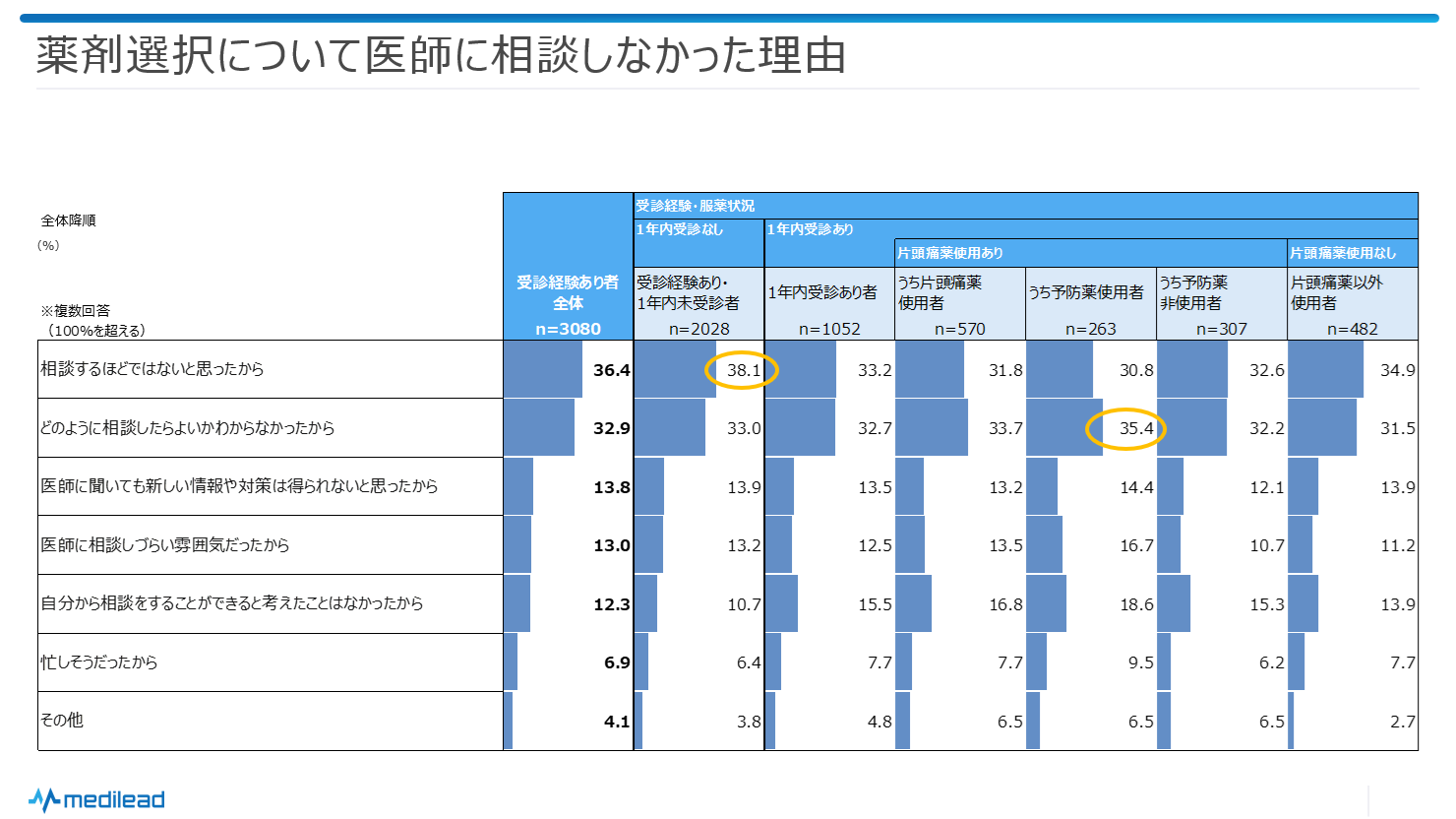 ただし、希望する薬剤がある場合には相談意向は一定数見られることから、「この状態であれば受診すべき」といった指針や、医師への相談方法に関する情報提供があれば、患者さんが自身の状態を正しく認識し、受診や薬剤選択の相談へと結びつく可能性があります。