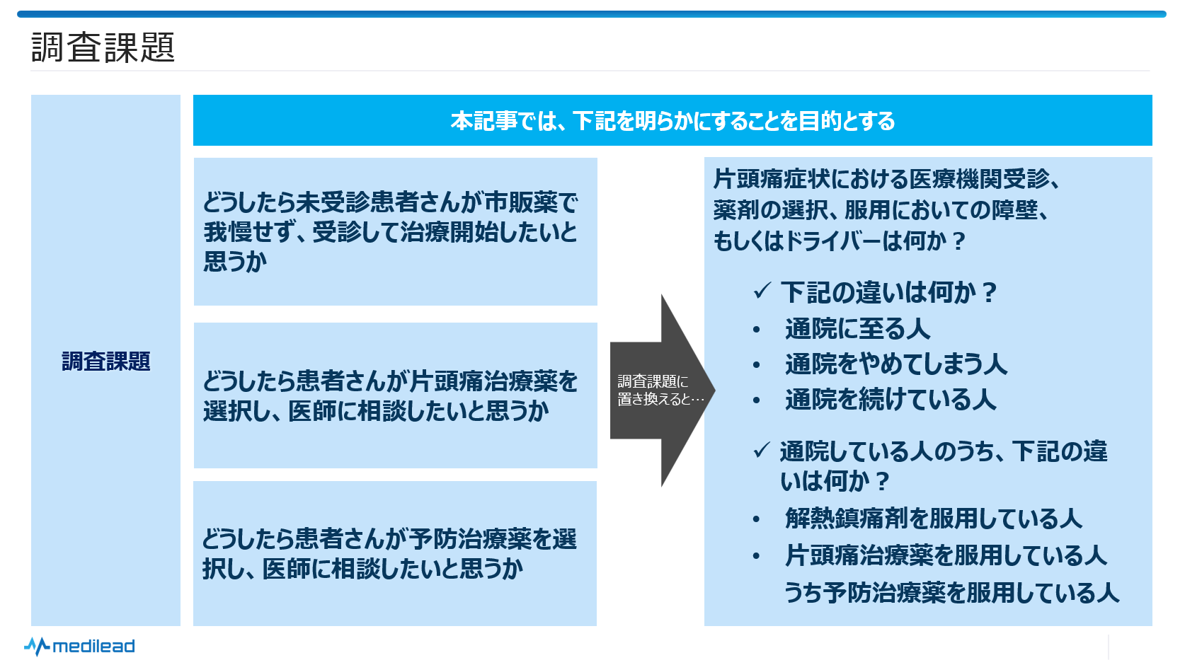 - 片頭痛症状における医療機関受診、薬剤の選択、服用においての障壁、もしくはドライバーは何か?