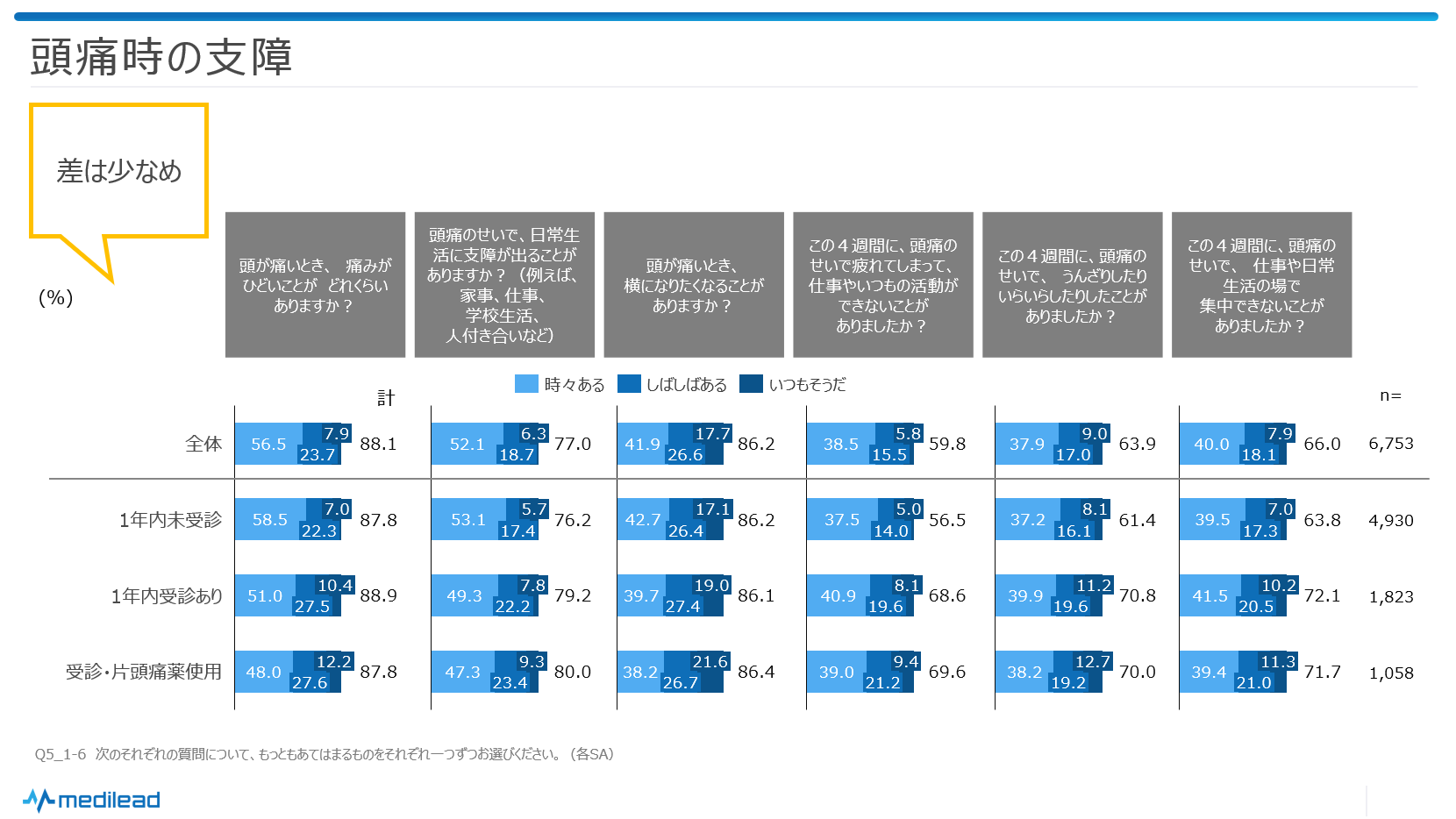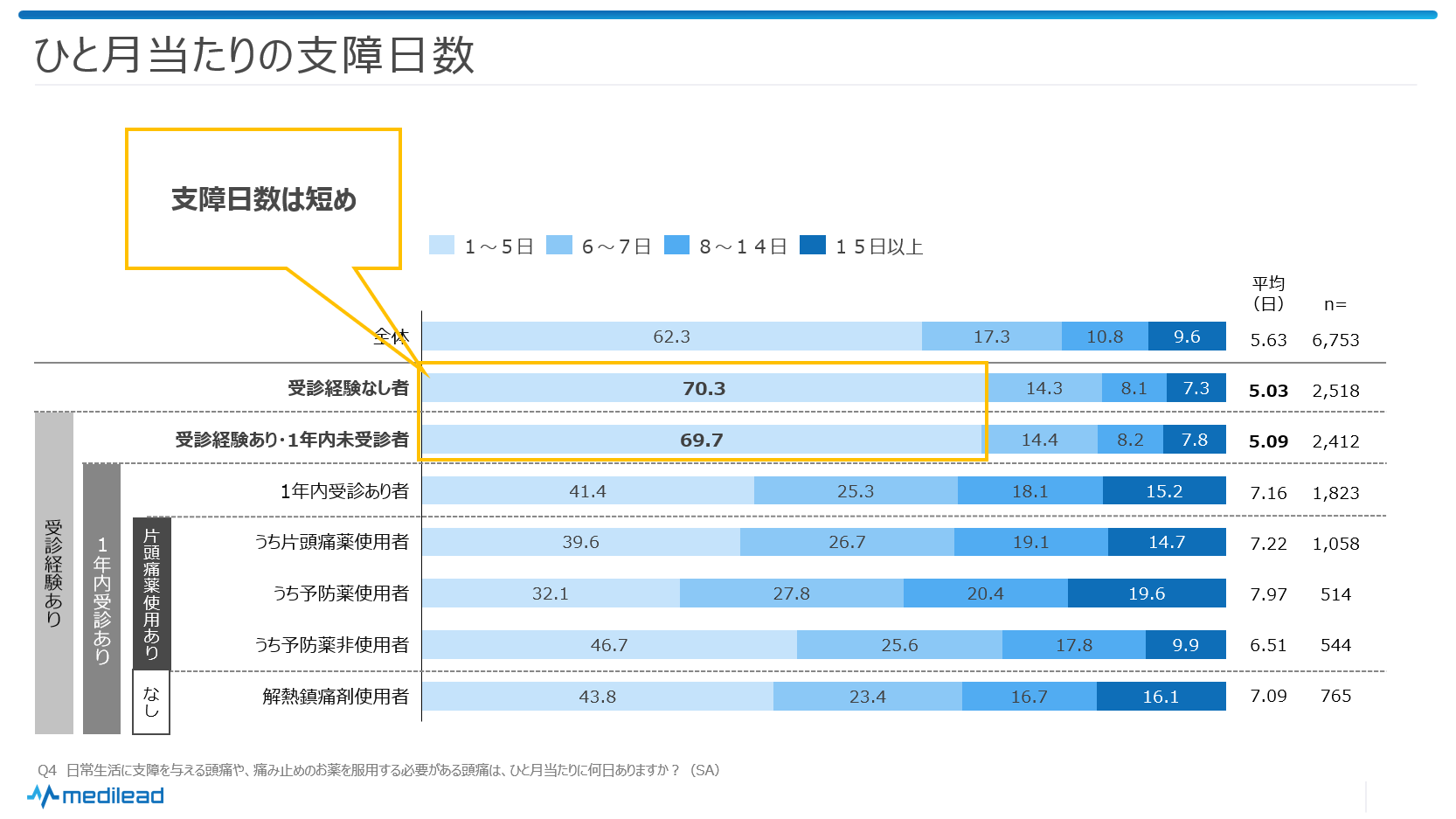 また、未受診者は支障のある日数が少ない傾向があることから、支障はあったとしても市販の頭痛薬使用により「その場をやり過ごす」ことが常態化しているか、もしくは症状の過小評価につながっていることが考えられます。