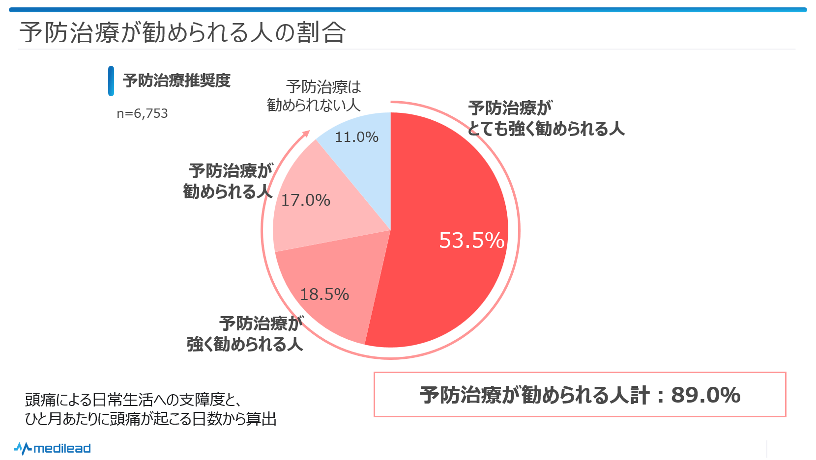 片頭痛症状のある人全体で9割近くが「予防治療が勧められる人」に該当し、そのうち半数以上は、「予防治療がとても強く勧められる人」でした。