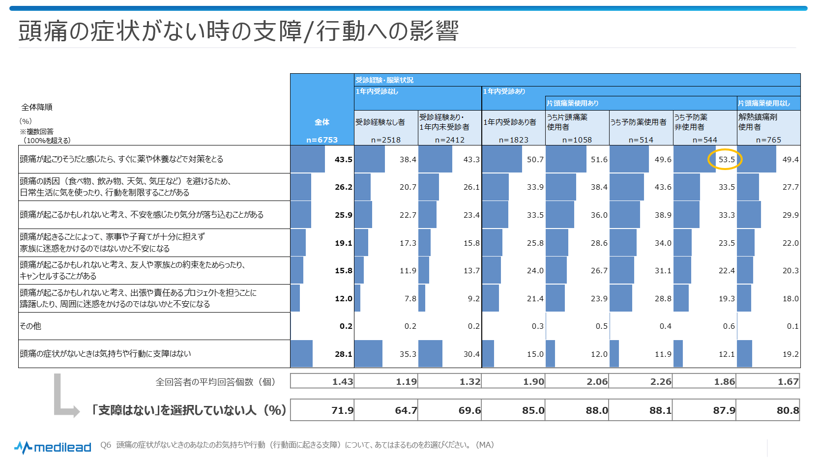 片頭痛薬は使用しているものの予防薬を使っていない人では、「頭痛が起こりそうだと感じたら、すぐに薬や休養などで対策をとる」と回答した割合が53.5%と、全体の43.5%と比較して特に高くなっています。