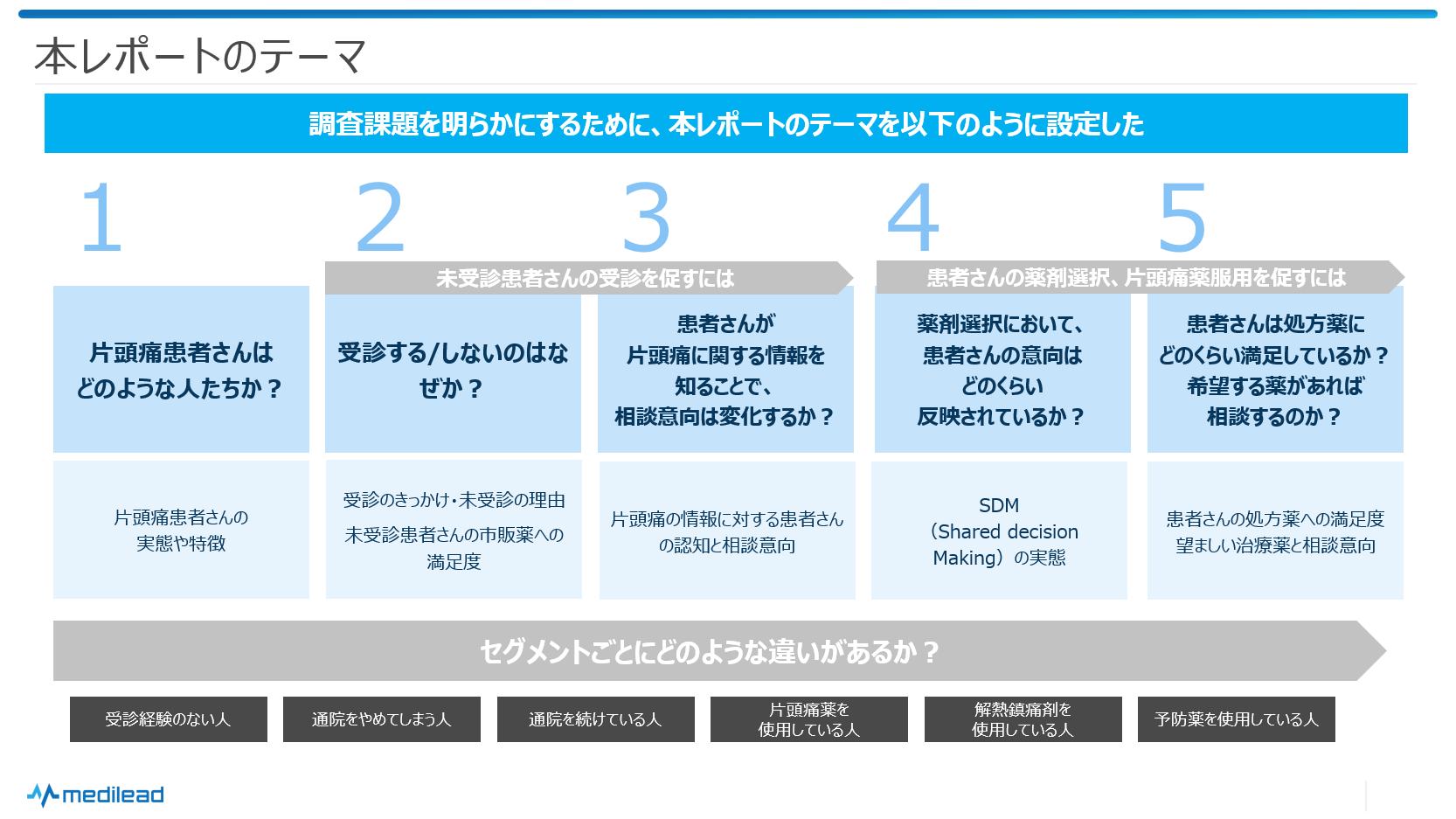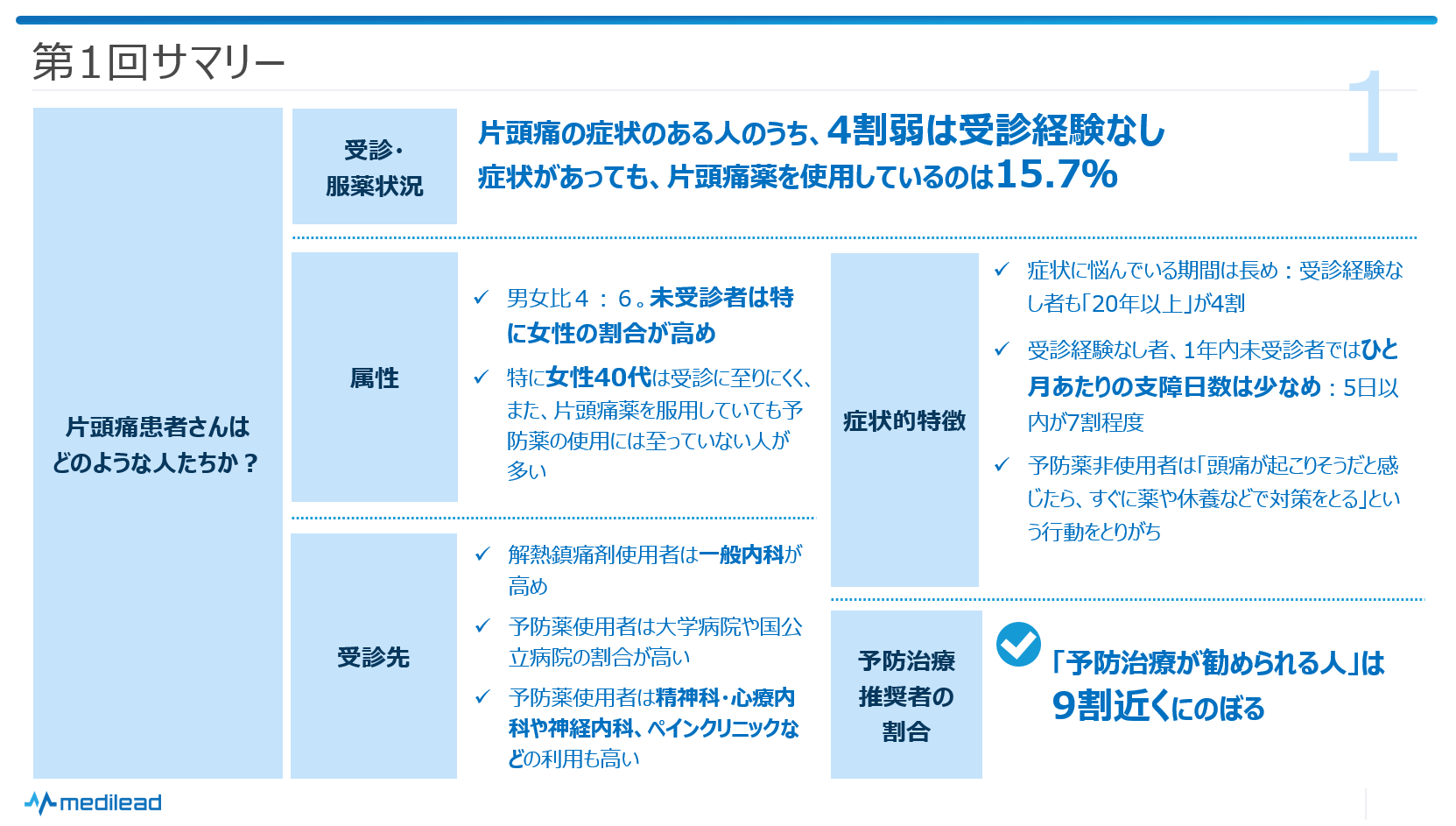 今回は「片頭痛患者さんはどんな人たちか?」について、患者さんの属性や受診状況、服薬状況などを概観しました。