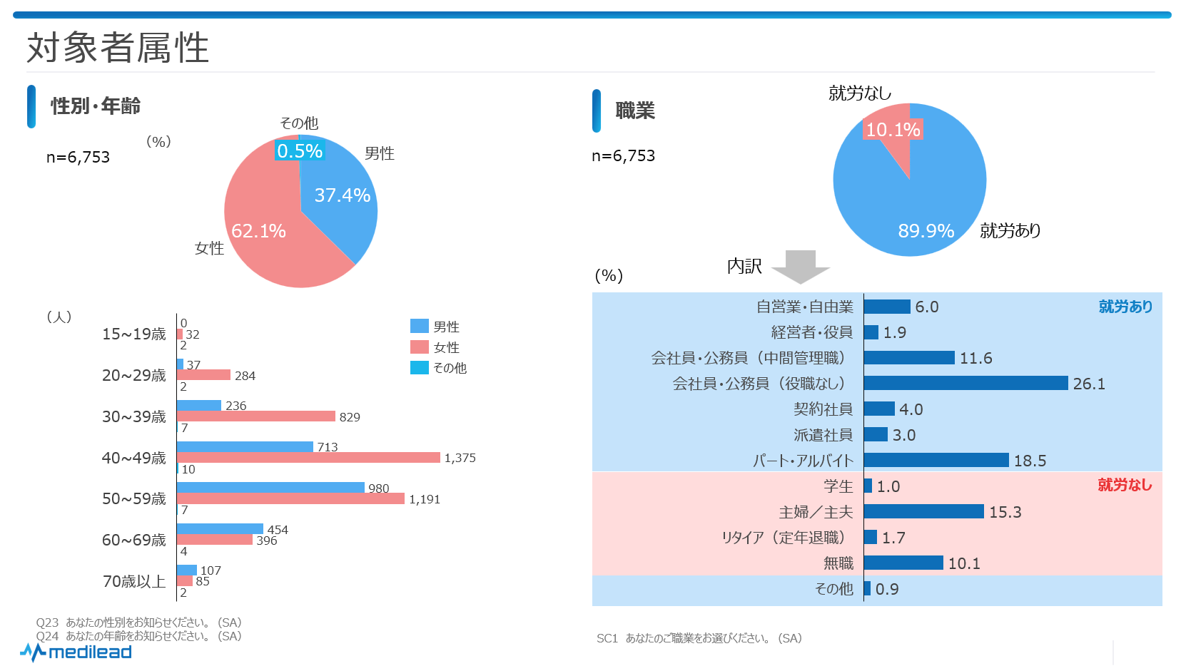 第1回の今回は、「片頭痛患者さんはどのような人たちか?」について取り上げ、主に属性や患者さんの症状、受診の状況などについて見ていきます。