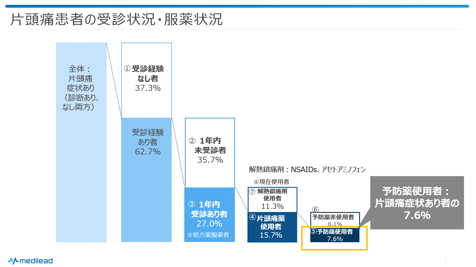 薬の服用状況を見てみますと、片頭痛薬使用者は15.7%、予防薬使用者はその半分の7.6%でした。片頭痛薬で治療している人はわずかで、その中でも予防薬を使用している人はかなり限られていることがわかります。