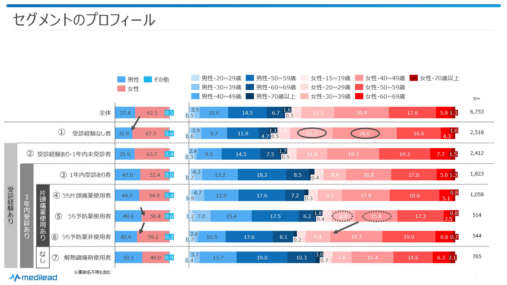 対して片頭痛薬使用者(セグメント④)、うち予防薬使用者(セグメント⑤)は男性の割合が高めです。全体の37.4%に対し、片頭痛薬使用者は44.7%、予防薬使用者では49.0%となっています。