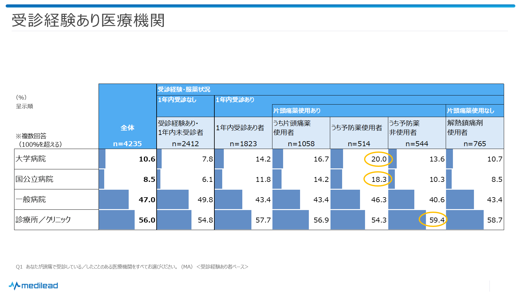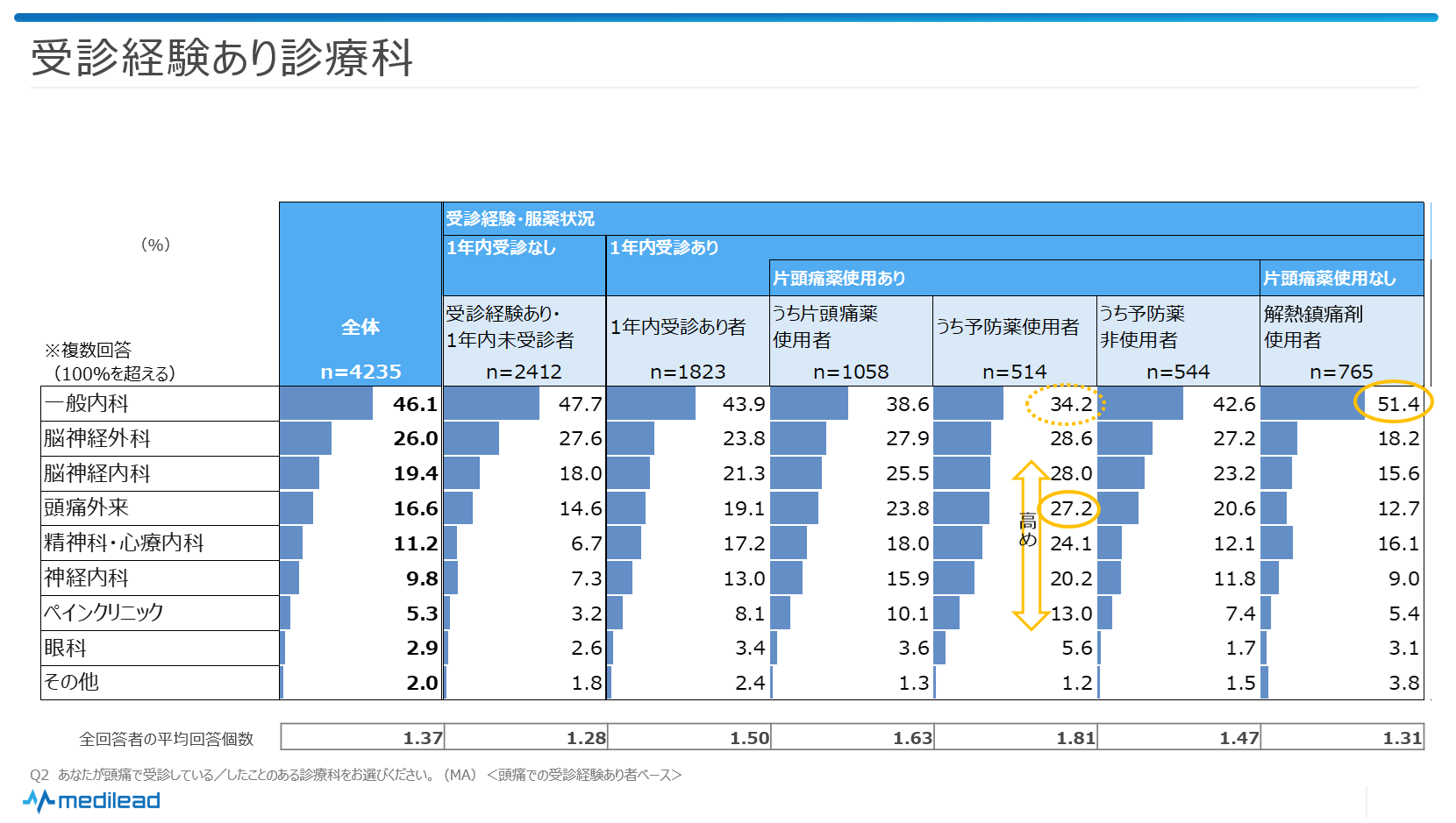 一方で、解熱鎮痛剤使用者は一般内科の受診経験率が51.4%と、全体の46.1%と比較して高めでした。一般内科では頭痛に対して片頭痛薬よりも解熱鎮痛剤が処方される傾向があることがうかがえます。