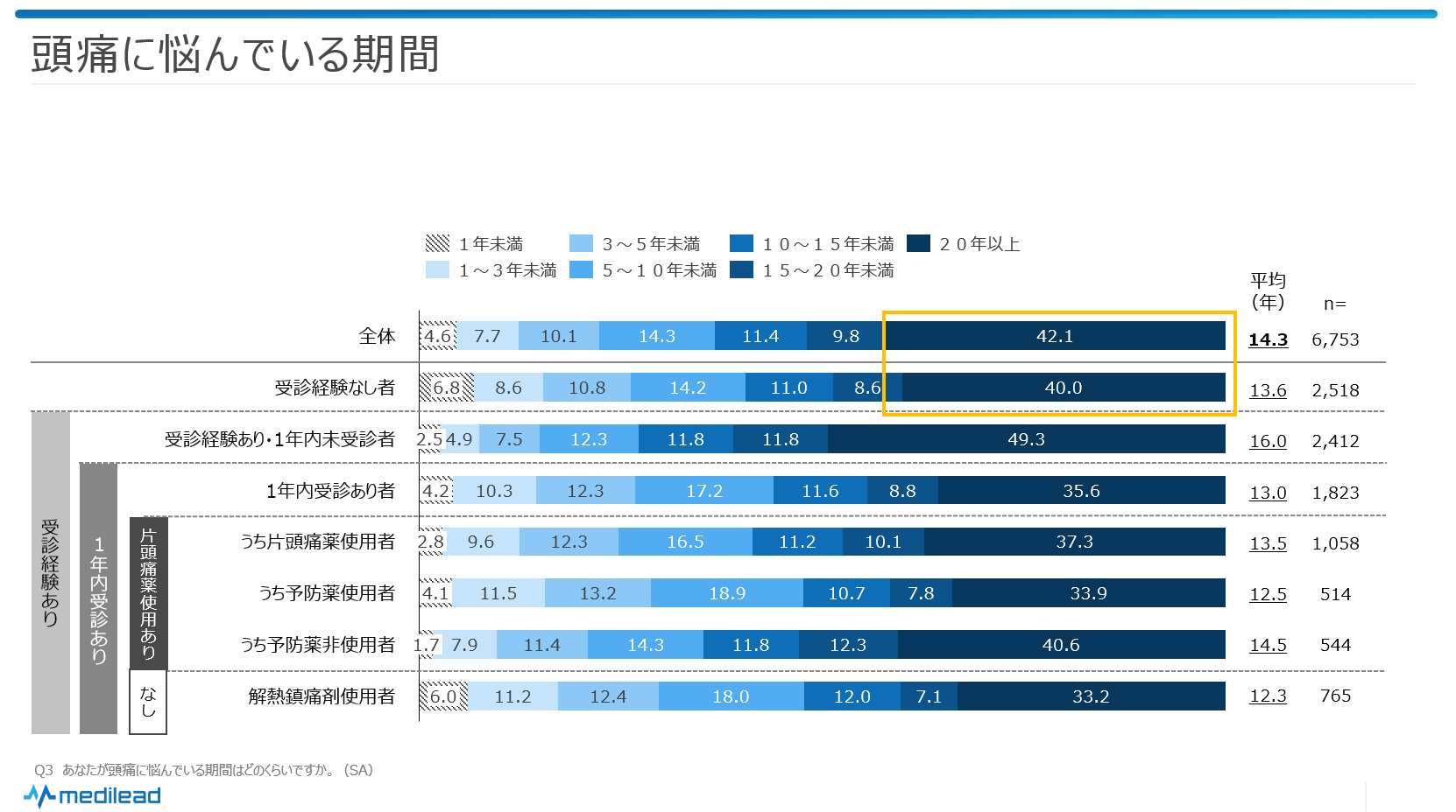 片頭痛患者さんはどのくらいの期間、頭痛に悩まされているのでしょうか。セグメント別に見たものが<図9>です。