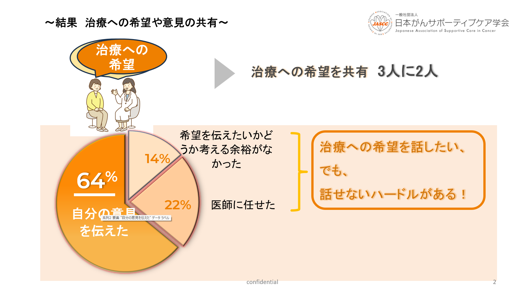 詳細な検査結果をもとに医療者から病名と、エビデンスに基づいた治療法の説明を受けた後、希望や考えを尋ねられた際に、自身の意見を伝えたと回答した患者さんは64%でした。一方で、「医師に任せた」と回答した患者さんは22%、「希望を伝える余裕がなかった」患者さんは14%でした。