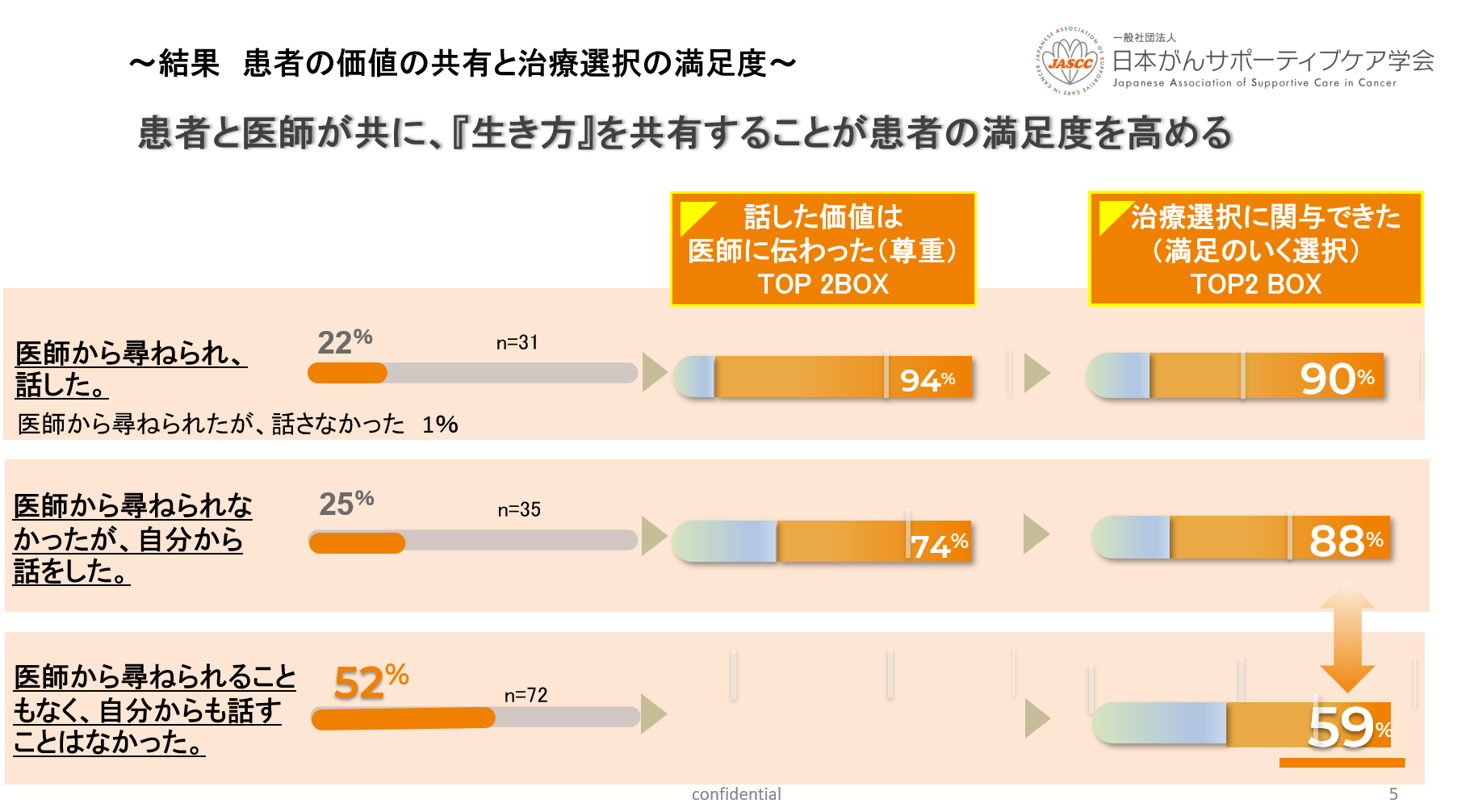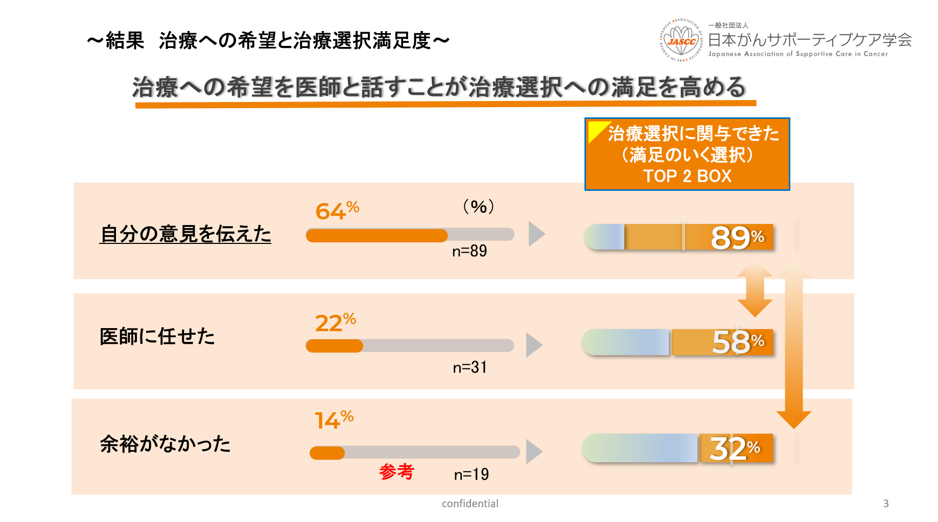 確かに生き方について医療者と対話できた患者さんは、決して多いとは言えません。しかしながら、医療者と生き方について率直に対話できた患者さんほど、治療選択に関与できたことへの満足度が高かったことが、今回の調査で明らかになりました。