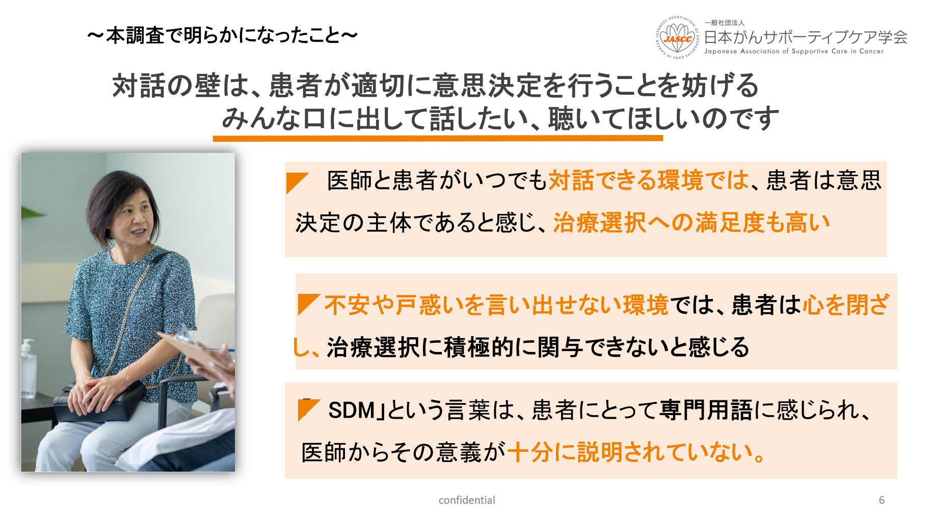 人は、混乱している時には決断能力が落ちるものです。その時に、相談できる場(たとえば、他職種の方のサポートが受けられること)の存在がより多くの患者さんに知られていれば、今回の調査結果も、違ったものになっていた可能性があります。