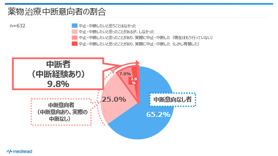 - 薬物治療を途中でやめた経験のある患者さんは約1割。治療をやめたいと思ったことがあるものの続けている患者さんは25% <図1>