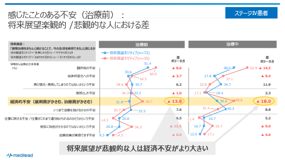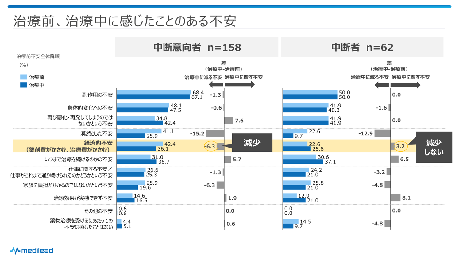 ここでは特に経済的不安の変化に着目した。中断意向者は治療前から治療中にかけて経済的不安が減少するが、中断者においては減少しない
