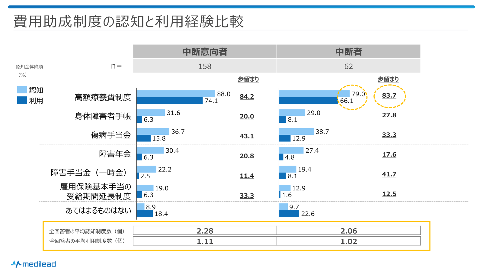 中断意向者と中断者を比較すると、中断者の方が制度の認知、利用が少なめ(平均個数が少ない)。また、最も認知・利用者の多い高額療養費制度においても、中断者は歩留まりが中断意向者より少ない(認知していても利用している人が少なめ)
