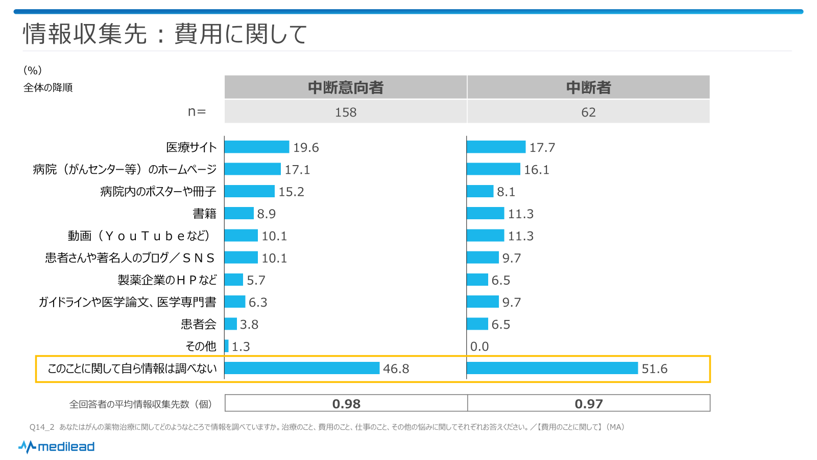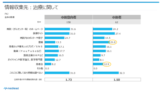 中断意向者と中断者を比較すると、中断意向者の方がやや情報収集先は多めで、病院のホームページや医療サイト、病院のポスターや冊子などを参照している。中断者は病院が発する情報等よりも、書籍や患者会の利用率が高めである
