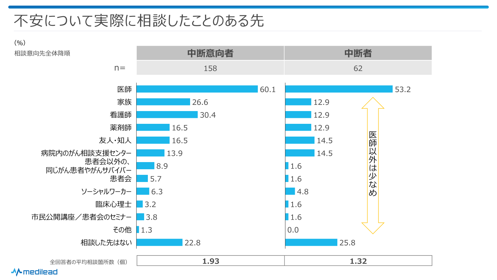 中断意向者よりも中断者の方が相談箇所数が少なく、医師以外には相談していない人が多いことがうかがえる